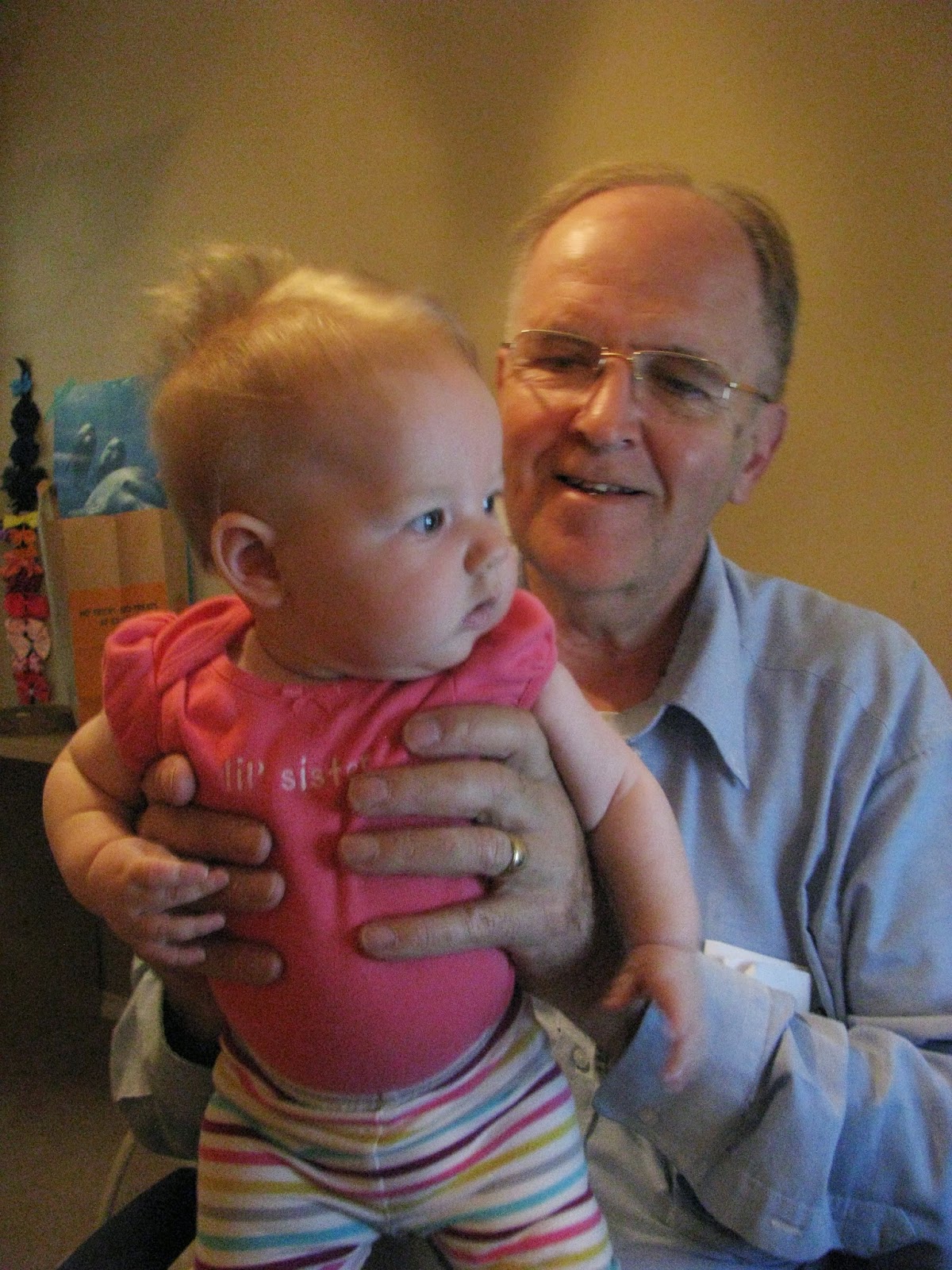 By some miracle, the vest is on! Papa and Grandma worked really hard with their silly faces.